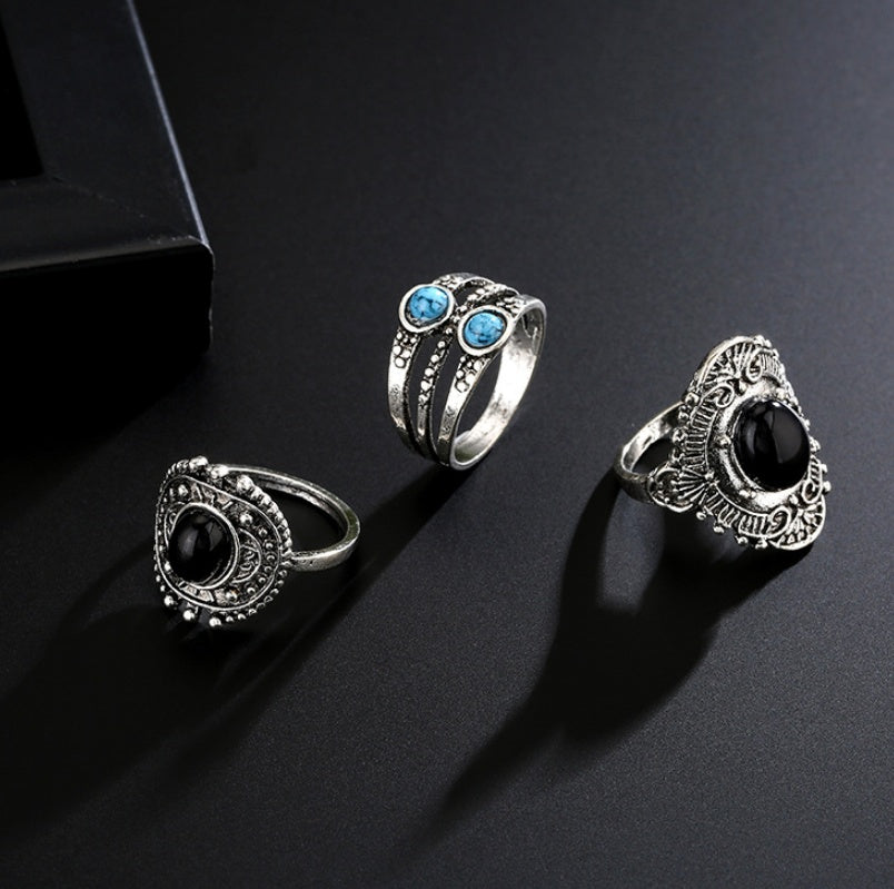Bohemian Retro Ethnic Style Inlaid Black Gemstone Opal Turquoise Joint Ring