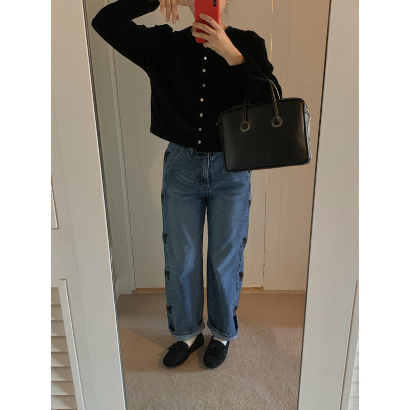 Embroidered Bow Cute Teenage Leisure Blue Jeans