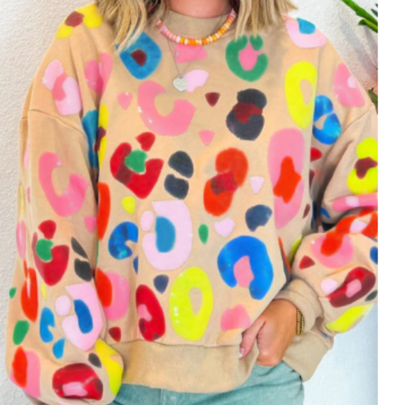 Winter Leopard Print Printed Crew Neck Sweatshirt