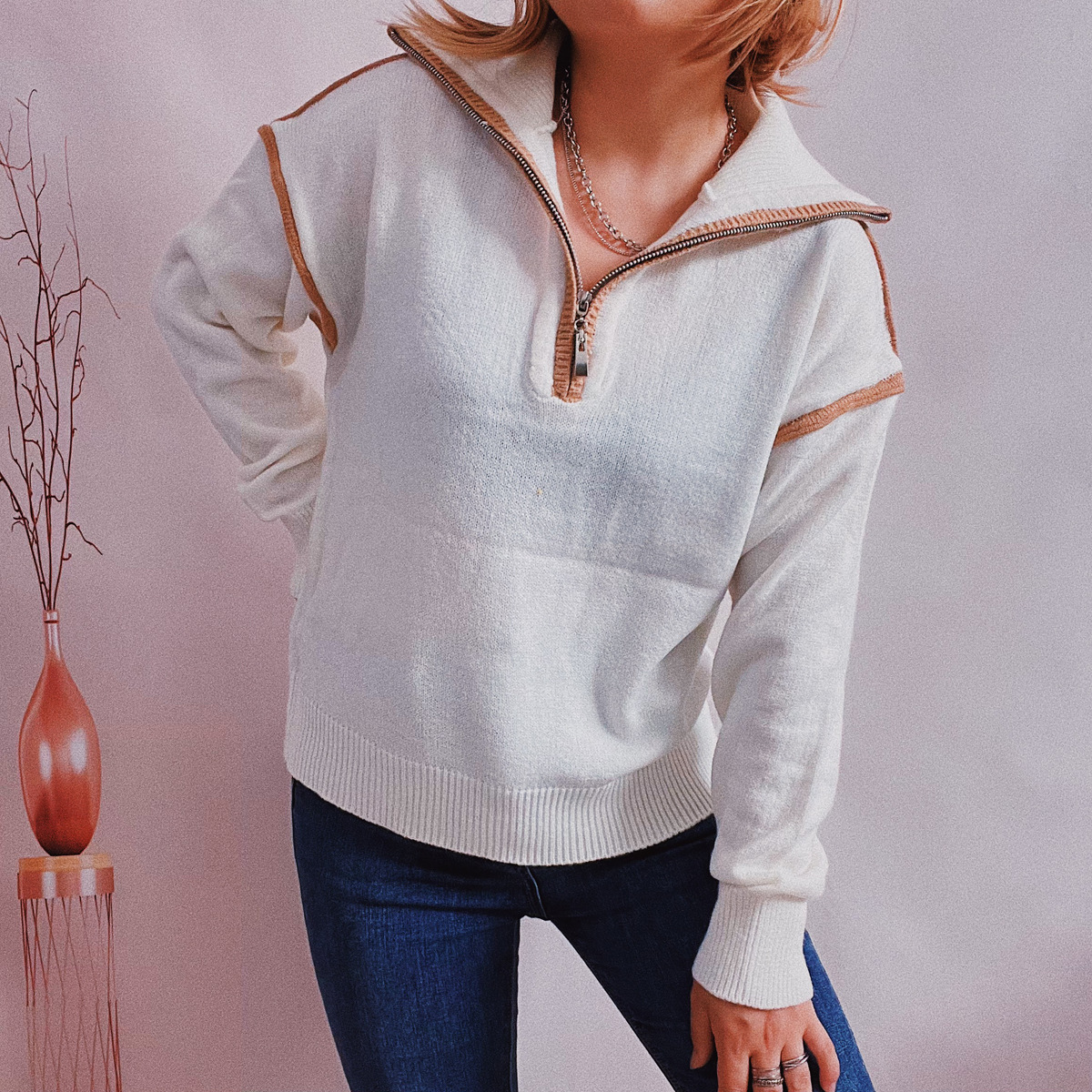 Women's Casual Knitted Zipper And Lapel Contrast Color Long Sleeves Sweater