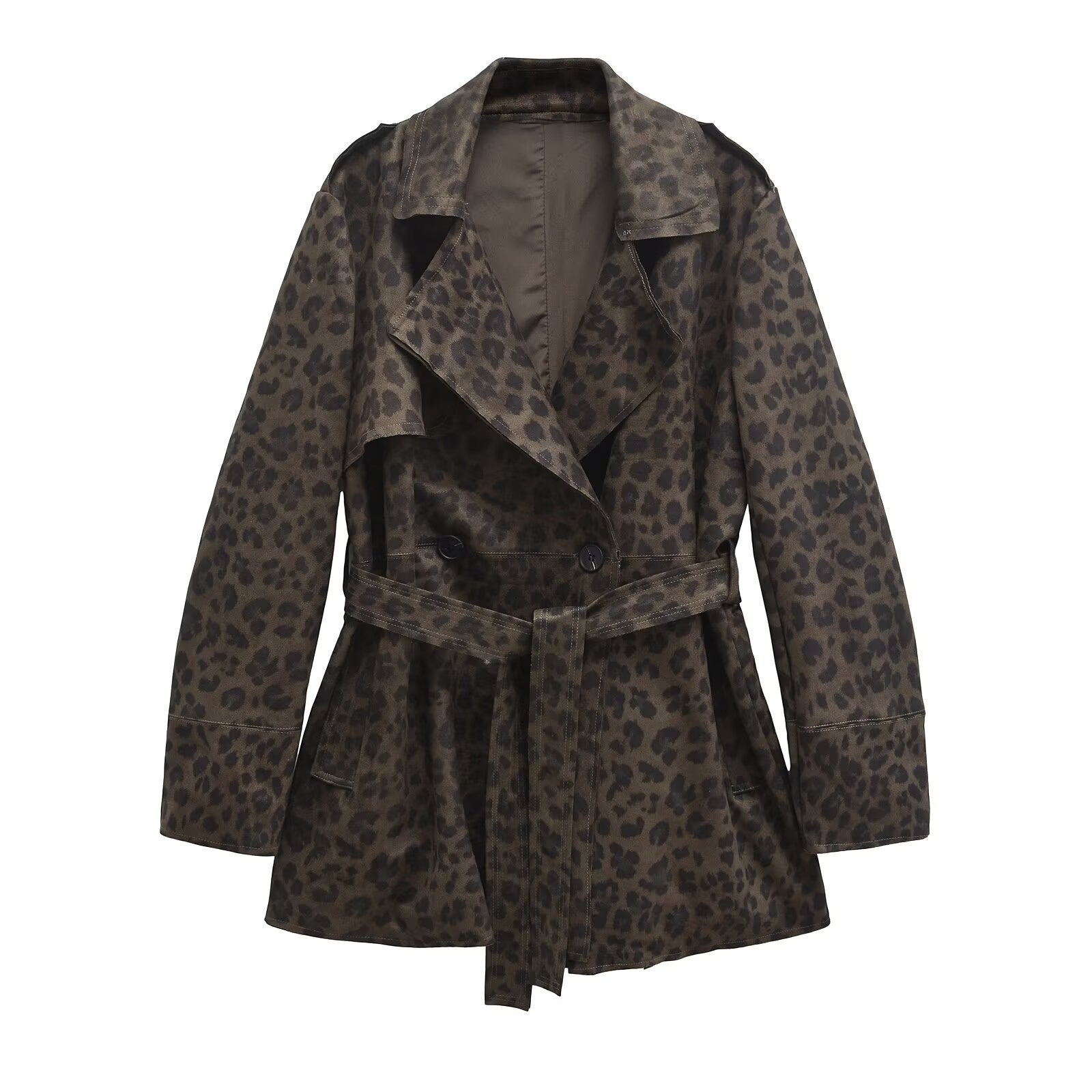 Women's Leopard Print Lapel Closing Belt Long Sleeve Coat